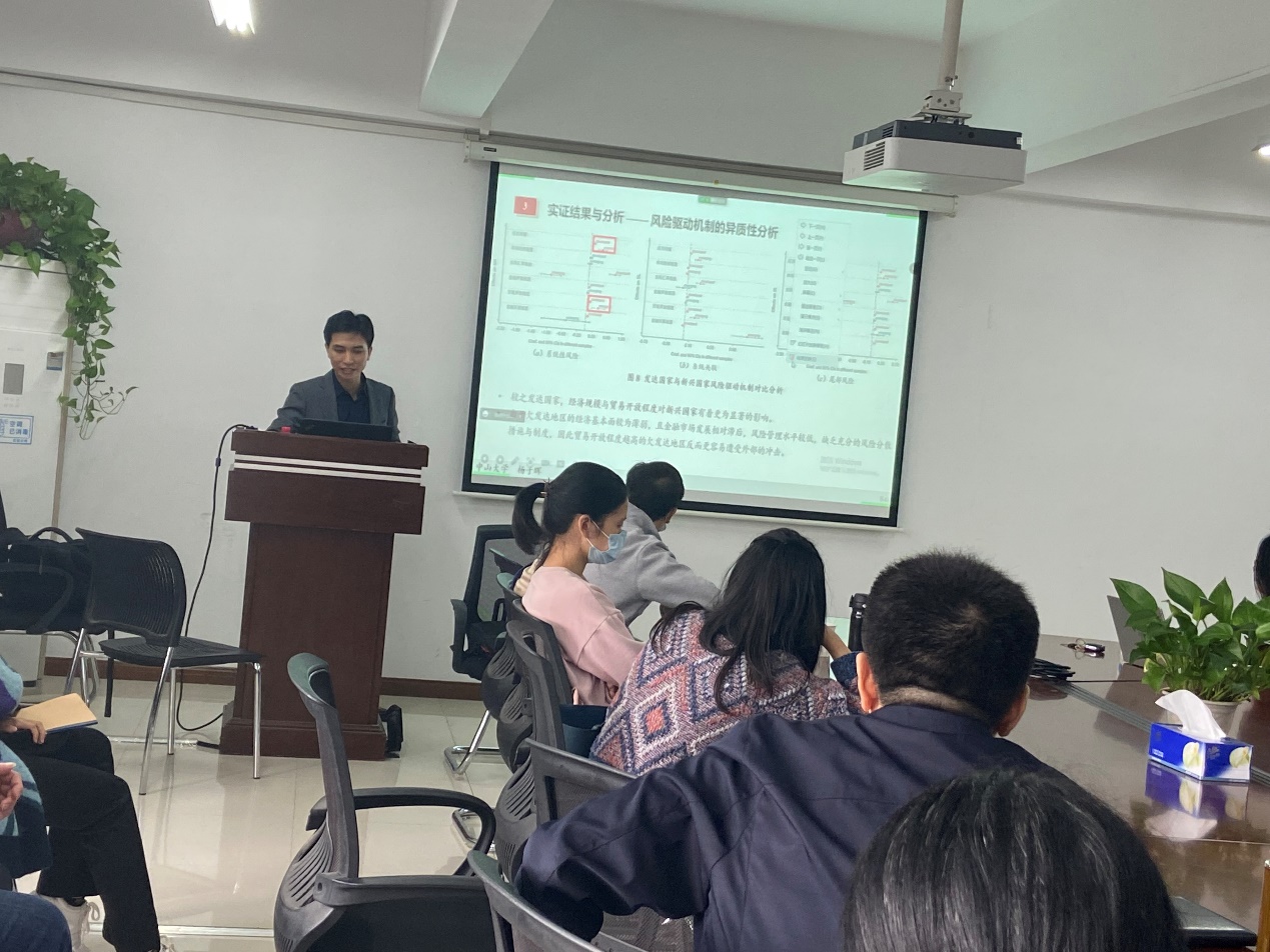 杨教授介绍道受新冠疫情冲击与国际贸易衰退的影响,系统性风险在世界金融市场间快速传染,国际输入性风险不断加剧,如何在全球外部环境错综复杂、我国金融开放纵深推进的过程中,有效应对国际市场风险冲击、防范金融市场的异常波动,成为“十四五”时期金融监管部门的重要挑战。为此,杨教授基于区分宏观审慎与微观审慎这一崭新的研究视角,采用最新发展的系统性风险分解方法,准确测度全球各市场的系统关联与尾部风险变动,深入剖析风险的驱动机制;分别考察在全球、发达以及新兴不同市场冲击下,系统性风险驱动机制的动态演变;探讨驱动因素在不同风险时间的异质性演变。为健全我国对国际金融风险防控机制、完善宏观与微观审慎政策协调框架提供重要指导。讲座最后,杨教授就如何剖析实际问题、提炼创新研究以及系统性金融风险研究的展望和与会教师进行了深入的交流,提出了宝贵的建议。对于徐健博士提出的未来系统金融风险研究方向的问题,杨教授给出三个建议,首先是气候金融,因极端天气和自然灾害有可能会损害经济金融体系的稳定性,因此可以基于气候变化引发的物理风险与转型风险对系统金融风险展开深入探索;其次对金融科技而言,需要解决如何衡量每家银行金融科技程度;最后也可以研究一些突发事件带来的影响,如新冠疫情对系统金融风险造成的冲击。对于张云怡博士提出的现在系统性风险研究趋势是否倾向于微观角度和对于房地产研究使用房地产板块股票数据是否可行的问题,杨教授给出肯定的回答,指出很多高水平的期刊现在是从微观的角度开展,如银行信贷业务等,房地产是金融风险影响比较显著的部门,目前房地产方面大多采用房地产板块的股票数据来看房地产金融风险。