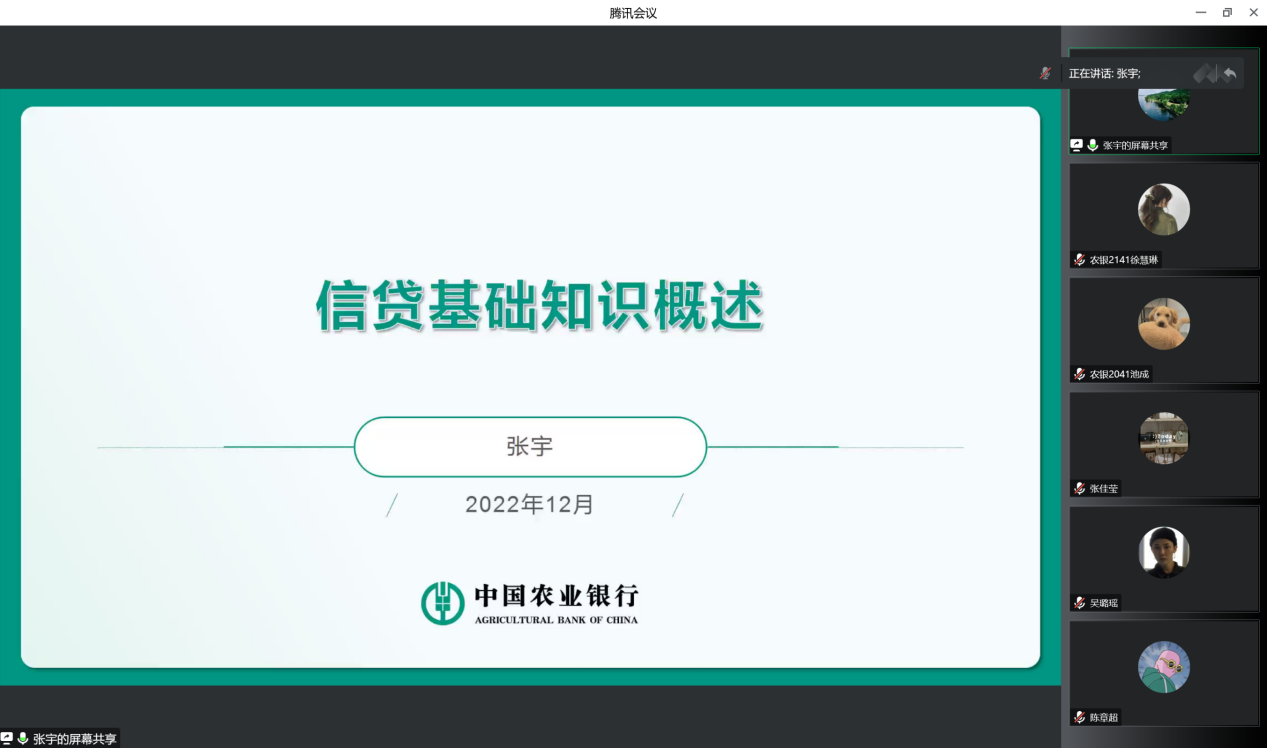 12月1日下午两点,球速体育第三节“农银业务课”在线上进行。本次课程由农行信贷管理部门张宇老师为同学们讲解,公司20级、21级农银班员工参加了本次课程。