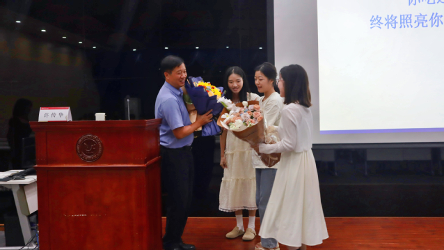 (图为员工向省级优秀党务工作者李正旺教授献花)