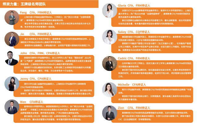 集合金融领域优秀团队,均为具备国内外顶尖院校硕士及以上学历,摩根、中金等世界500强企业工作从业经历,有5年以上教学经验的职业讲师;并为员工配备CFA协会行业导师,为后续学习、考试、实习、深造、就业提供支持。