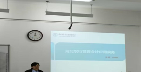 付雯雯老师的授课主题是“湖北农行管理会计应用实务”。付老师从管理会计总体情况、管理会计在湖北分行中的应用、管理会计数据查询与获取三个方面向同学们介绍了会计在企业中所处的地位与作用,管理会计和会计管理的区别,以及会计数据对比对分析各大行、各地区绩效差别的作用。