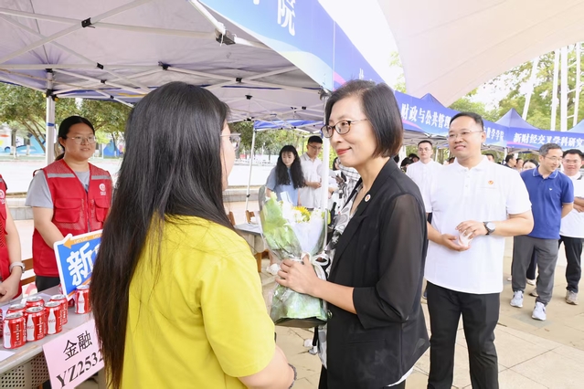 校领导走访公司本、硕迎新点,亲切与新生家长交流。本科迎新点,董事长方洁将一份大学规划的纸张递给公司“最远新生”、来自新疆精河金融2541姜立阳,叮嘱“做好大学规划,期待你在湖经书写美好新篇章。”研究生迎新点,金融硕士YZ2532柯妍拿出本科毕业时与董事长的合影,送上自己对师长对母校最真挚的祝福。