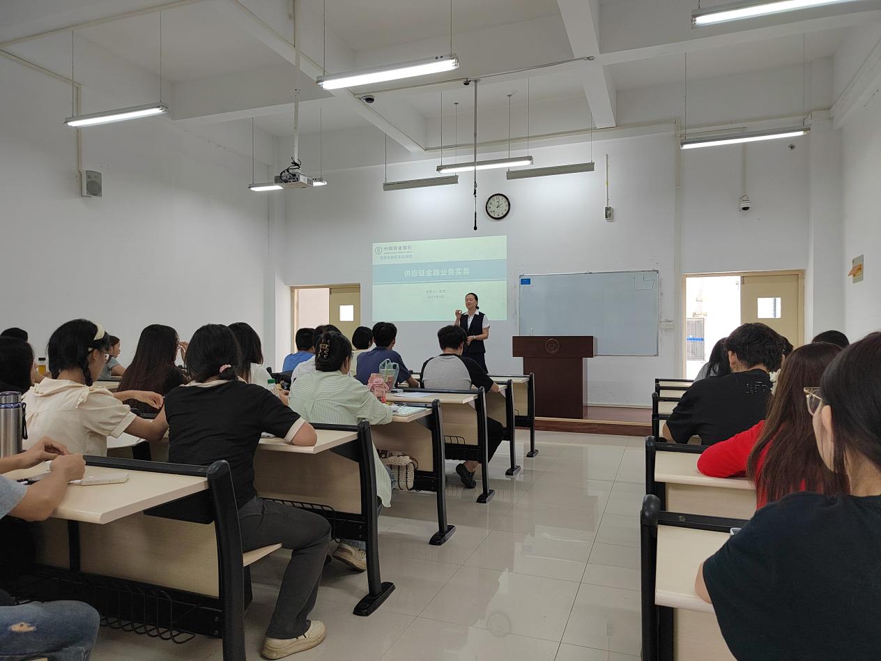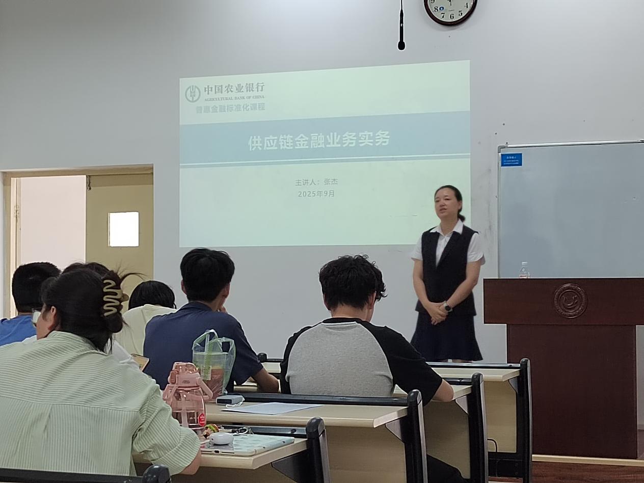 本次授课主题为“供应链金融业务实务”。张老师以乳品、建筑、医药等产业链为例,剖析供应链上下游融资痛点,系统讲解农行“保理e融”、“订单e贷”、“政采e贷”、“融通e信”等线上产品的场景应用、流程要点及风险管控,并分享了“脱核链贷”数字化模型在普惠金融中的最新实践。同学们通过鲜活案例,直观理解了供应链金融“一点对全国、数据信用替代主体信用”的核心理念。