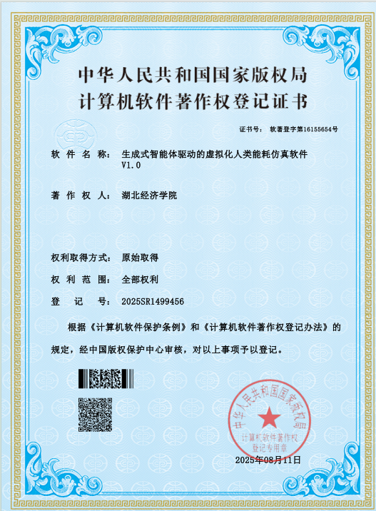 公司金融硕士研究生李彦铎主导研发的“生成式智能体驱动的虚拟化人类能耗仿真软件”近期正式获得中华人民共和国国家版权局颁发的计算机软件著作权登记证书(登记号:2025SR1499456)。李彦铎的指导教师为公司金融硕士研究生导师、公司党委副书记付宏教授,该项软著第一作者为李彦铎,合作者为付宏教授、雷帮军教授和余娇娇博士。