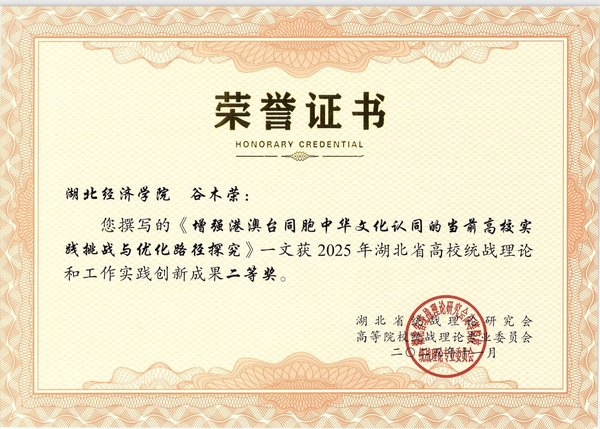 近日,2025年湖北省高校统战理论研究会第40次学术年会在荆州举行。会议对全省高校统战理论和工作实践创新成果进行了表彰。公司谷木荣老师向研究会提交的《增强港澳台同胞中华文化认同的当前高校实践挑战与优化路径探究》一文荣获二等奖。
