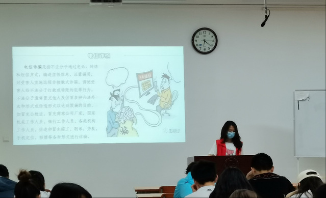活动伊始,公司青协各部门进行了合理分工,确定好具体活动流程,完成前期相关事宜。随后,青协面向全院招募志愿者,并5月20日完成志愿者筛选培训工作,最后根据志愿者的人数和志愿时段,将志愿者们于晚点名期间细分到各个班级去宣讲。宣讲过程中,志愿者们主要介绍了金融诈骗的惯用手段,在生活中我们应该如何识别、防范金融诈骗等,提醒同学们尤其注意电信诈骗,并通过真实案例让同学们对金融诈骗的形式有了更加深刻的了解。
