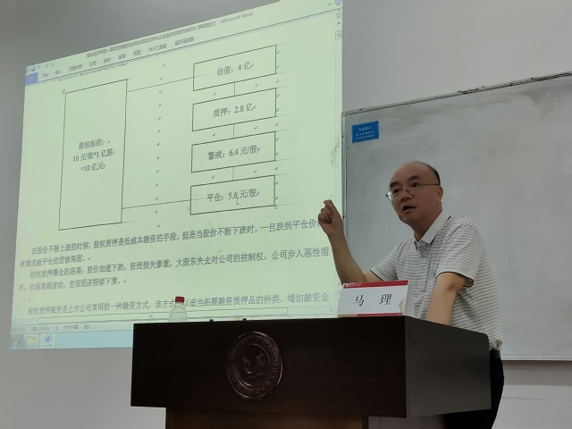 讲座伊始,马理教授首先简要介绍自身主要研究经历和聚焦“货币政策与宏观调控”研究领域的主要研究成果。紧接着,他以科研团队在研成果“股权质押融资业务风险与企业融资保障”为切入点,以案例交流的形式讲述了“如何选取研究主题”、“如何进行研究分析”、“如何凝练撰写研究成果”等方面的研究心得和体会。期间,他围绕这一主题与公司研究生分享其在研究范式、研究思路、实证方法选择等方面的思考和建议,在详细讲解后提出现阶段我国上市公司股权融资应以“降风险、稳增长”作为双目标的观点。