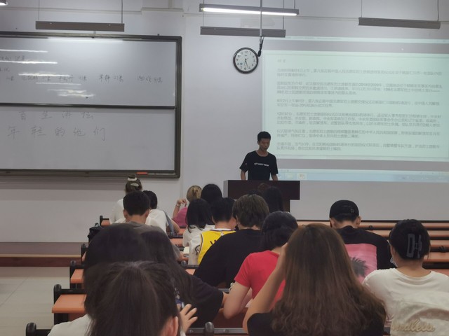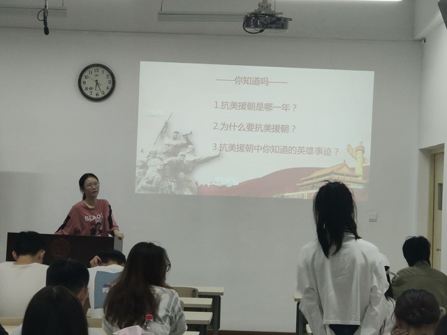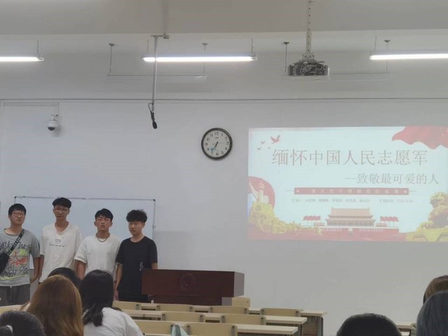 金融2043团支部切入点新颖,首先以提问的方式增强了同学们的参与度,随后,该支部根据提问的内容讲解了抗美援朝战争,深刻地阐明了抗美援朝的意义。最后,金融2043团支部向大家讲述了韩国没有一次性归还志愿军遗骸的原因,说明寻找并发现中国志愿军遗骸这项工作的不易。回顾那场艰苦卓绝、可歌可泣的抗美援朝战争,中国人民志愿军雄赳赳、气昂昂,跨过鸭绿江,在朝鲜战场上舍生忘死、奋勇向前。在前进的道路上,我们要继承先烈遗志,弘扬伟大的抗美援朝精神,倍加珍惜先烈用鲜血和生命换来的和平环境,坚定不移地走和平发展道路,为实现中华民族伟大复兴的中国梦不懈奋斗。
