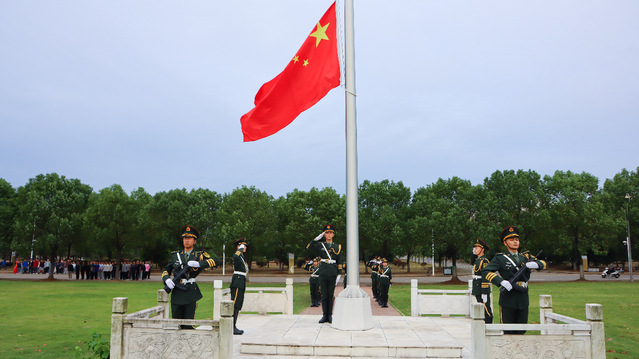 首先,在全体同学的注目礼下,国旗护卫队护送五星红旗进场。伴随着庄严的《义勇军进行曲》,五星红旗冉冉升起,全体行注目礼,庄严肃穆。