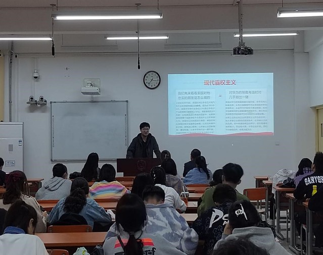 回望往昔峥嵘岁月,金试2141团支部按照时代发展的顺序对中国和世界体系的变化进行了阐述。该支部同样以长津湖战役为切入点,讲述了中国人民为了站起来、富起来、强起来的奋斗史。重返联合国后,中国始终秉承和平共处五项原则,致力构建人类命运共同体和国际新秩序。接着,主讲人结合时事,谈及中美关系。“中国特色大国外交已经被越来越多国家所认可,把握新时代思想理念,中国必然会创造出新辉煌!”