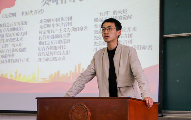 活动伊始,全体成员起立,奏唱中华人民共和国国歌与共青团团歌«光荣啊!中国共青团»。随后,团委老师赵坤明致辞,公司员工兼职团委副书记冉欧雯与体育经济与管理公司员工兼职团委副书记周雨轩分别发言。