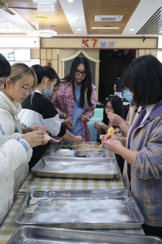 团建活动前,团支书联系合作方,提前准备好所需材料与工具。而后,在欢声笑语下,干事们一起学习并灵活运用技巧,包出属于自己的特色饺子,并将其交由提前约定好的餐厅阿姨煮熟盛出。参与者可随喜好添加调味,品尝自己的劳动成果。
