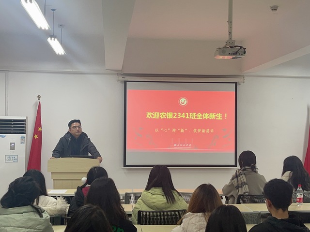 高师副书记以“金融是现代经济的核心”为切入点,向同学们介绍了农银长江班的办学特色、人才培养模式以及就业前景,并对同学们提出了三点希望,一是转变思维、与时俱进。嘱托班级同学及时转变思维,实现从具体知识学习到躬耕实践、从被动学习到主动学习、从封闭到多元的转变。二是提前规划、科学管理。希望同学们珍惜时光、提前做好职业规划,下得苦功夫、求得真进步,全面提高综合素质。三是赓续前行,奋楫争先。勉励同学们从历届学长学姐们手中接过奋斗的“接力棒”,跑出属于农银2341班的青春新篇章。