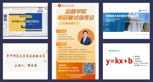 会议伊始,姚璐璐老师简要分析了今年考研的形势,并介绍了今天分享的主要嘉宾。高途考研特约名师杨攀老师以“复试备考公式y=kxb”为切入点,引导同学们正确理解复试成绩“y”、初试成绩“b”、本科综合实力“k”和复试表现“x”之间的关系,并重点就国家线涨跌情况、复试备考注意事项等方面做了详细的分析。原农银1941班员工周佩然、原金工1941班员工解佳萌、原农银1941班王璐瑶依次分享了考研上岸武汉理工大学、华中师范大学和中国地质大学的复试经验和心路历程。