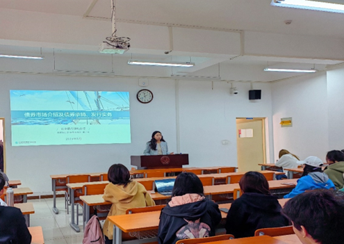 本次授课主题为“商业银行的金融债券市场业务”。黄老师讲课逻辑清晰,简明扼要,举例翔实。她首先为同学们介绍了基本的金融债券市场,让同学们了解债券市场内涵和功能;进而以武商集团为例讲解具体的债券和股权,引申出目前我国基本债券市场情况;最后以长江三峡集团为例细化讲解了债券承销制度体系、中期票据募集等知识点。