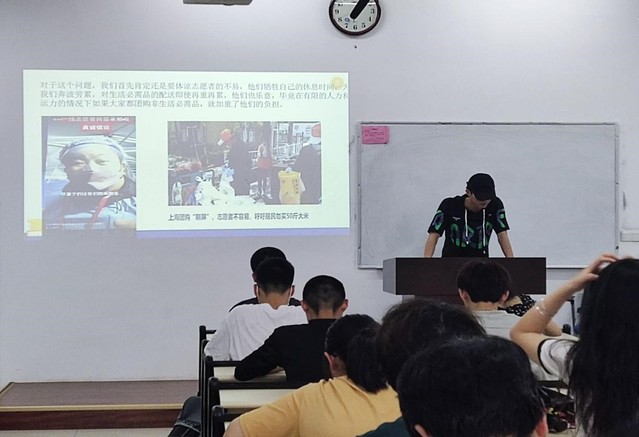 在本周的百生讲坛中,金融2041团支部首先以上海严峻的疫情为切入点,讲述了封控小区志愿者、医护人员艰难抗疫的全过程。接着,该支部播放了一只短视频,视频中显示大白志愿者为送社区业主团购的整箱可乐、雪碧而累倒在地。之后,金融2041团支部还给大家讲述了疫情之下上海人过于“精致”的案例:囤二三十斤的水果、让大白帮送烟酒、做核酸时盛装出席......最后,该团支部对在抗疫路上默默付出的逆行者表达了敬意。疫情让这座城市放慢了节奏的同时,也放大了无限的爱与力量。在这条抗疫路上,无数人用自己的方式助力抗疫,将点点微茫汇聚成光,只为那迟到的春天!