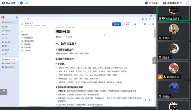 为扎实推进2024届毕业生就业工作,有力促进全院员工更高质量更加充分就业,公司寒假期间按计划开展“朋辈导师说就业”系列就业经验分享活动,分享会邀请往届学长学姐、优秀员工分享成功经验、讲述方法路径、提供决策参考。系列分享会分为三期,每一期聚焦不同的主题,分别为“求职就业篇”、“考研升学篇”及“政策性就业篇”。2月4日晚,第一期经验分享会“求职就业篇”以线上的形式举行。公司就业专员、2024及2025届员工参会,会议由姚璐璐老师主持。