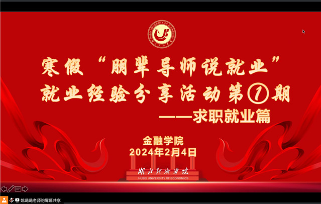 分享会上,原金试Q0641班员工、球速体育welcome武汉员工会副会长周韵、原金融Q0941班员工、球速体育员工会秘书长楼世元、原金融1941班班长王宝玲、原金试1941班副班长游诗爽、现农银2041班吴辉翰五位主讲嘉宾依次进行了有关市场求职的经验分享。他们结合自身求职、工作经历及工作体会,从就业形式、求职观念、求职技巧、心态调试等方面做了全面和细致的分享,重点向学弟学妹着重介绍了网申、笔试、面试的具体流程、应对技巧和注意事项。姚璐璐老师简要总结分享会,鼓励同学们借鉴学长学姐们的成功经验,牢牢把握即将到来的春招的校招机会,合理制定寒假计划,顺利实现就业。