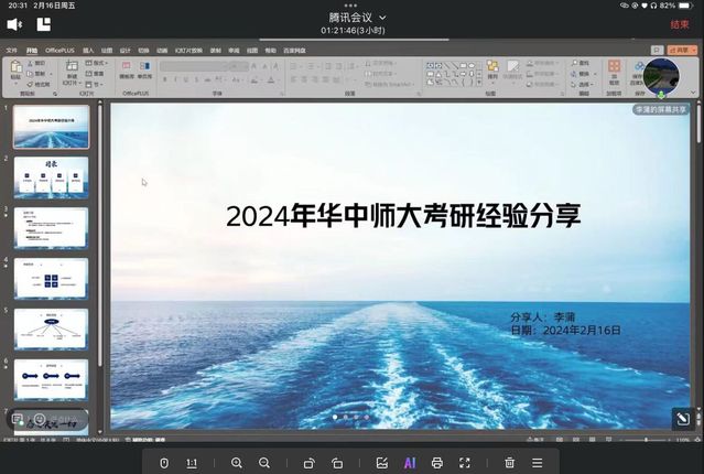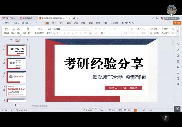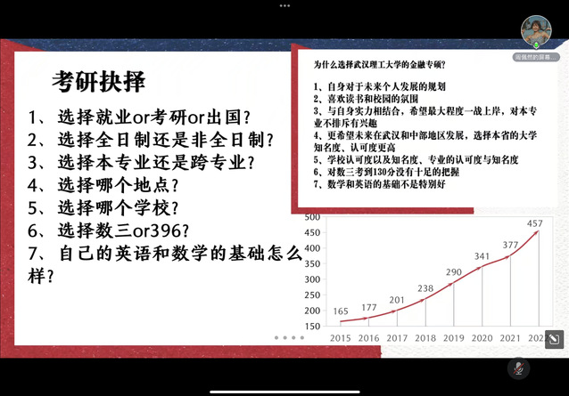 分享会上,现农银2041班邓子阳、原农银1941班周佩然、原金融Q1842班黄伊领、原金融S2021班王琦、原金融1941班李蒲五位同学依次进行了有考研升学的经验分享。他们结合自身实际情况,从择校策略、初试复试备考方法、海外升学准备事项、心态调整等方面,全面系统地分享了考研升学的宝贵经验及注意事项。
