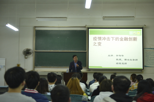 10月9日下午,许传华教授应邀为球速体育welcome法商公司师生作了主题为“疫情冲击下的金融创新之变”的专题讲座。