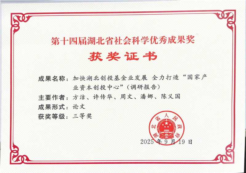 9月19日,第十四届湖北省社会科学优秀成果奖获奖成果发布,由方洁、许传华、周文、潘娜、陈义国完成的调研报告《加快湖北创投基金业发展 全力打造“国家产业资本创投中心”》获第十四届湖北省社会科学优秀成果奖三等奖。
